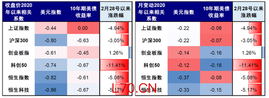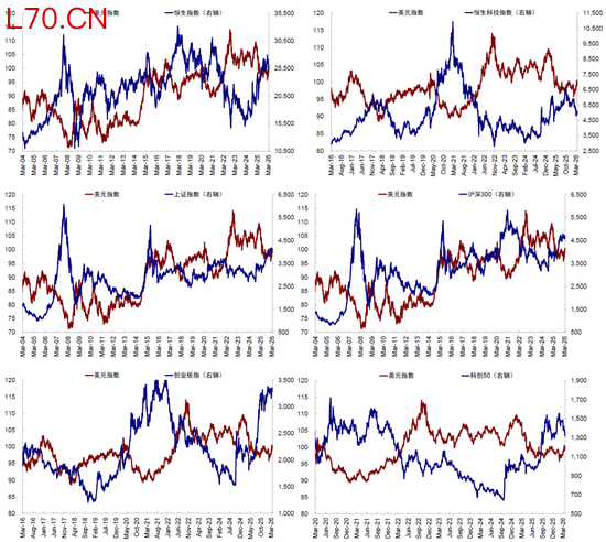 图表:从历史走势可看出,港股及A股成长对美元指数更敏感,尤其是恒科和科创50