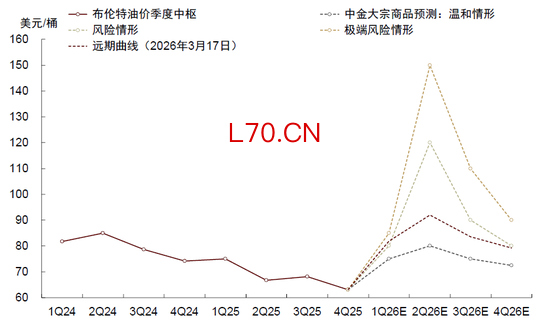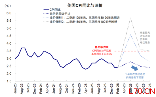 那什么情况下美联储年内彻底无法降息?我们测算,要想让通胀抵消掉2025年下半年高基数的作用而无法回落,持续维持在3.5%以上,那么油价就要维持在100美元以上、且一直持续到三四季度。这与中金大宗组预期的极端情形一致,他们判断,如果美以伊冲突持续至年底,布伦特油价将在二季度升至150美元/桶,三、四季度油价中枢也将维持在100美元的高位。