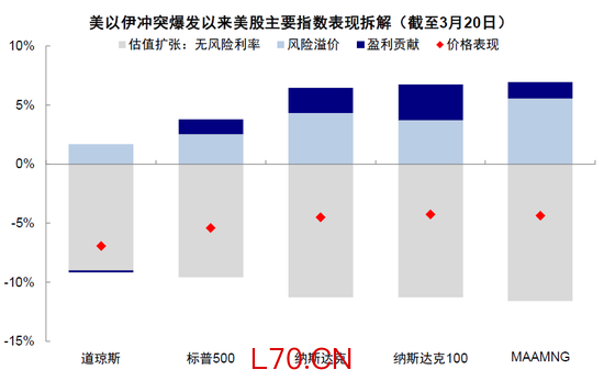 图表:标普500和纳斯达克指数的风险偏好修和盈利上修的贡献使得整体指数跌幅相对可控