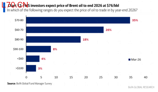 从这个角度,把债券市场认为年内不降息的预期“翻译”成对局势的判断,就等于预期冲突到三四季度冲突且油价一直维持在100美元以上,足以见其有多悲观,而权益市场显然并没有这么悲观,可能的原因是债券与股市因为投资者群体差异和盈利影响传到较慢而存在割裂,同时也可能“期待”特朗普在下半年中期选举压力下仍有妥协可能(TACO)。最新的美银美林全球投资经理调查也显示,市场平均预计年底油价在76美元左右,仅有11%预期会超过90美元。这一大相径庭的预期,既意味着可能的风险,也孕育着潜在的机会。
