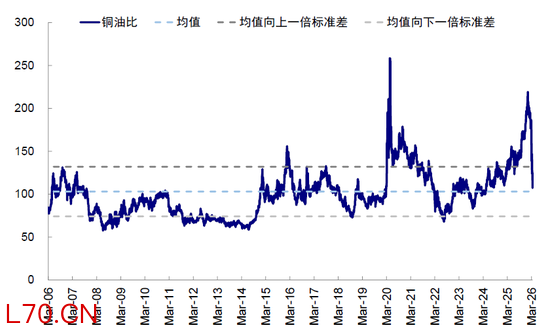 图表:铜油比从1月初高点219降至当前的103,触及2010年来均值