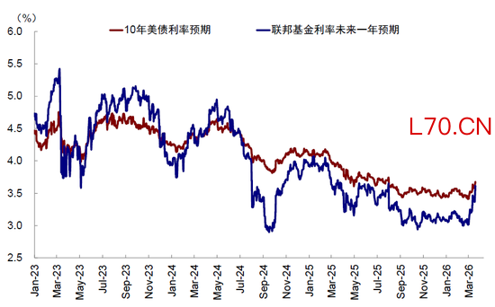 ► 美债:同样预期年内不降息。2月28日美以伊冲突爆发以来,10年美债利率抬升44bp至4.38%,从驱动因素来看,1)实际利率主导(31bp),通胀预期同步抬升(13bp),反映市场已经将高油价的压力转化为对美联储维持高利率水平更久(Higher for Longer)的定价。2)利率预期主导(27bp),期限溢价基本持平,反映利率的波动主要集中在对降息路径的重新锚定。这与利率期货反映的信息一致,期货隐含的联邦基金利率未来一年预期自2月28日以来抬升70bp,意味着美以伊冲突爆发前,市场预期的年内2次降息预期已经被抹去,隐含降息时点也从FOMC会议前的2026年10月进一步延后至2027年9月。相对悲观的预期意味着,4.4%的长端美债利率已经基本计入了最为严苛的货币政策路径,反之冲突持续时间二季度内可以结束,那么当前长端美债或具备做多空间。