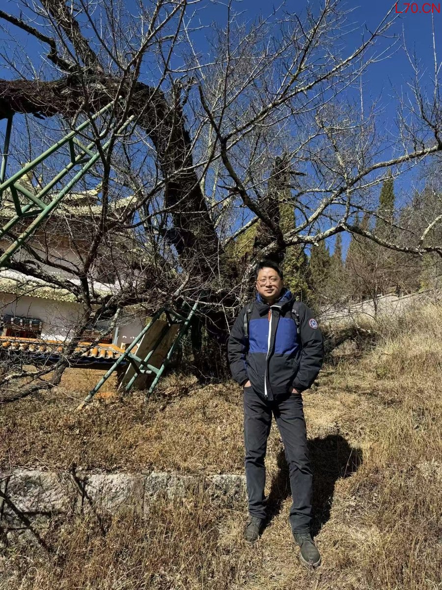 总导演黄瀛灏站在云南宁蒗县扎美寺的元朝梅树前,这棵古梅已有700多年树龄