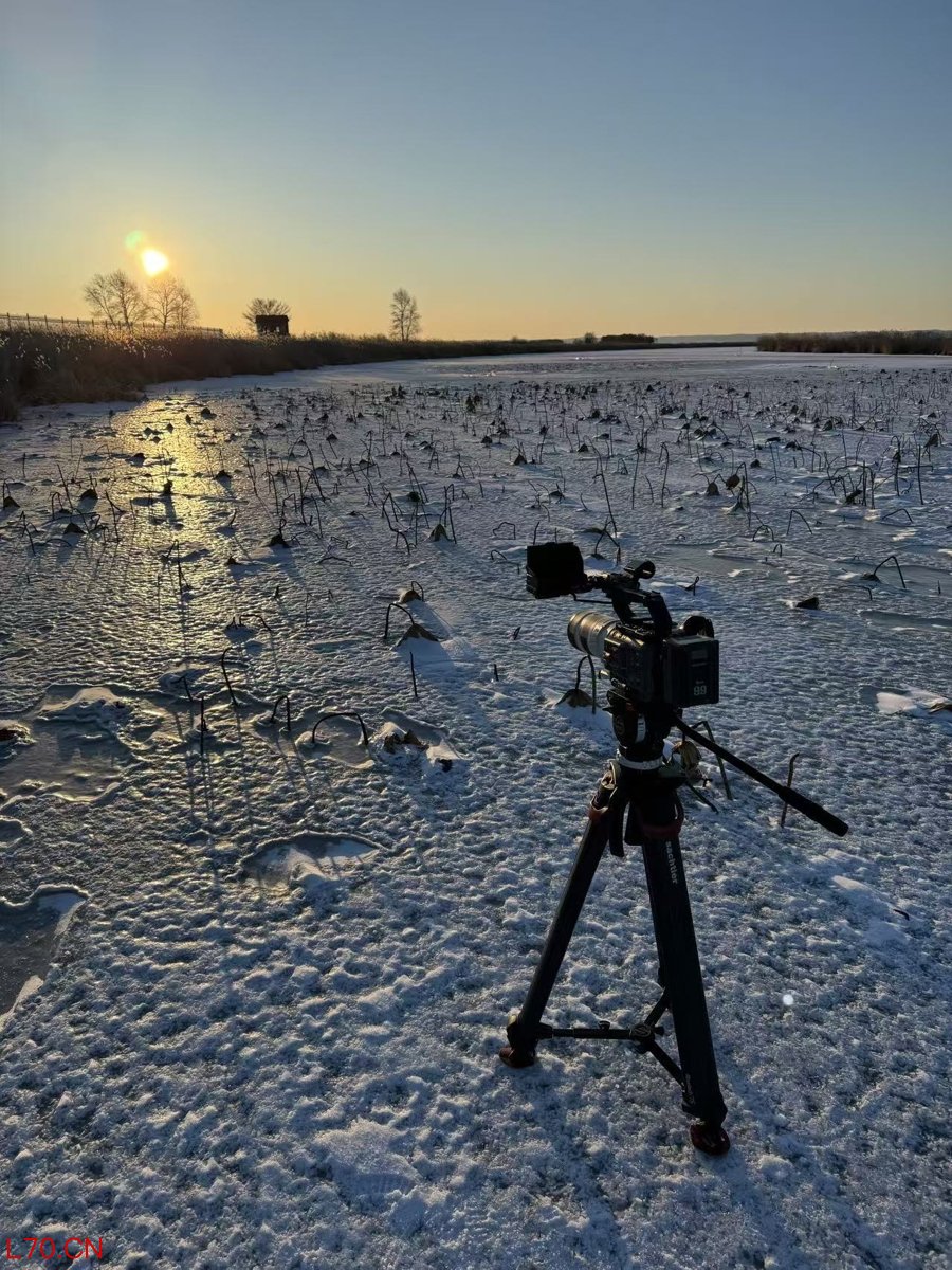 摄像机正在拍摄-20℃的黑龙江逊克县边疆村荷花塘