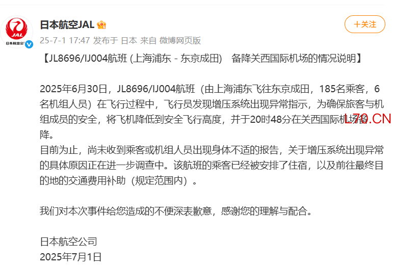日本航空回应上海至东京航班备降:增压系统出现异常指示