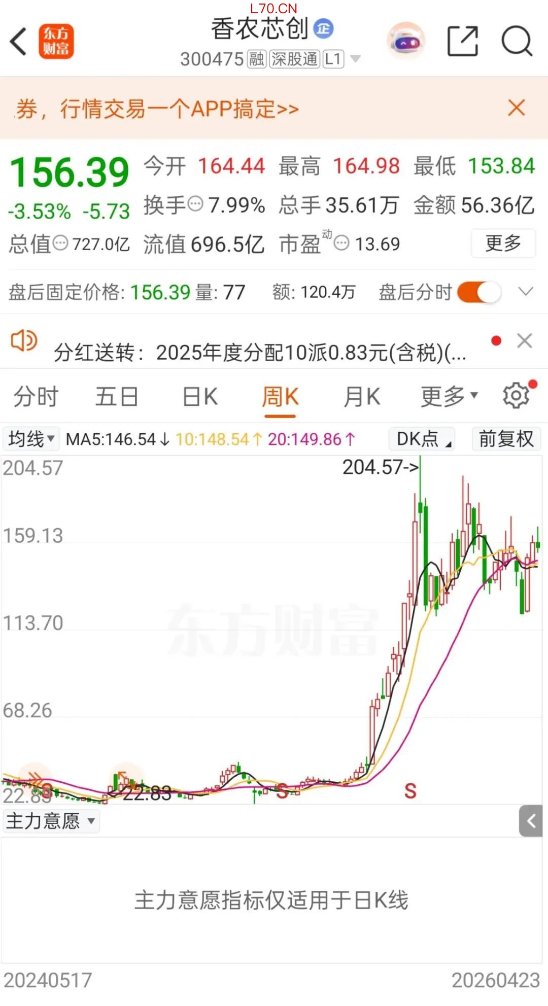 截至4月23日收盘,香农芯创报156.39元/股,总市值为727亿元。