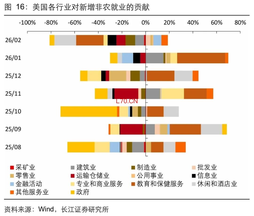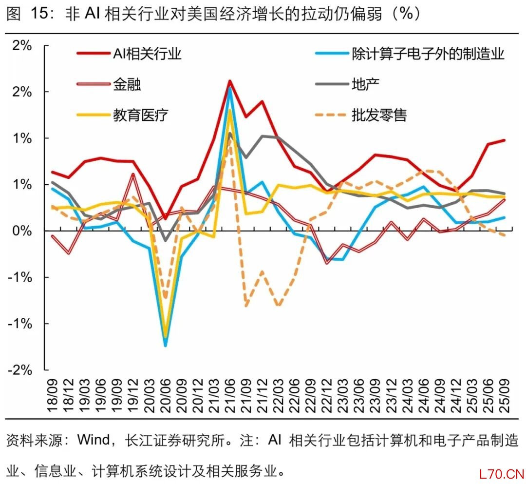 事实上,即便是本轮经济表现相对较强的美国,不论是从经济增长还是新增就业来看,也“偏科严重”,主要归功于AI产业和金融等少数行业,传统制造业和服务表现惨淡。