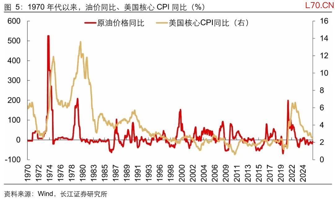 高油价是否会带来美国核心通胀显著上行?数据显示,海湾战争以来,油价向美国核心通胀的传导明显减弱,不论是油价还是核心通胀,涨幅都明显低于“大滞胀”时期,对经济的冲击也显著减弱。