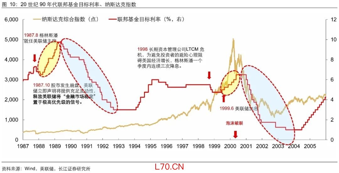 如果说过去两轮货币政策周期还没完全走出全球金融危机的阴影,那我们不妨看看1990年代格林斯潘主政下的美联储,不仅“加息来得慢、降息来得快”而且“加息幅度小,降息幅度大”。