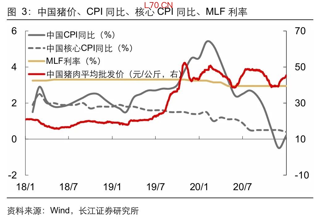 一是2019年非洲猪瘟导致猪价上涨,并带动我国CPI快速上行,但由于经济仍处下行周期,核心CPI一路下行,央行不仅没有因为CPI高企而采取货币紧缩,反而是在11月降息5bp;