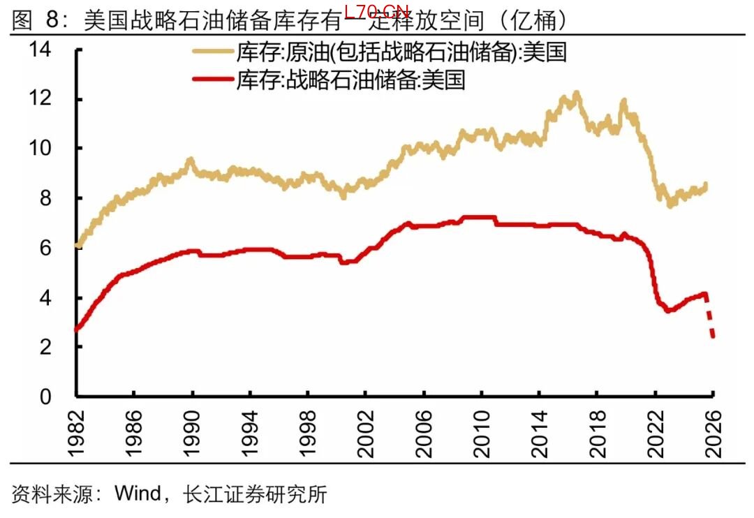 我们认为,这主要得益于:1)能源结构转型,使得美国经济对于原油的依赖度持续下降,当前美国每单位GDP的原油消耗量仅为1970年代峰值的1/4;2)技术进步,页岩革命推动下,美国石油贸易差额由负转正,从石油净进口国转为净出口国;3)战略库存储备,截至2026年3月20日,美国原油库存高达8.7亿桶,其中战略储备库存就占近一半。